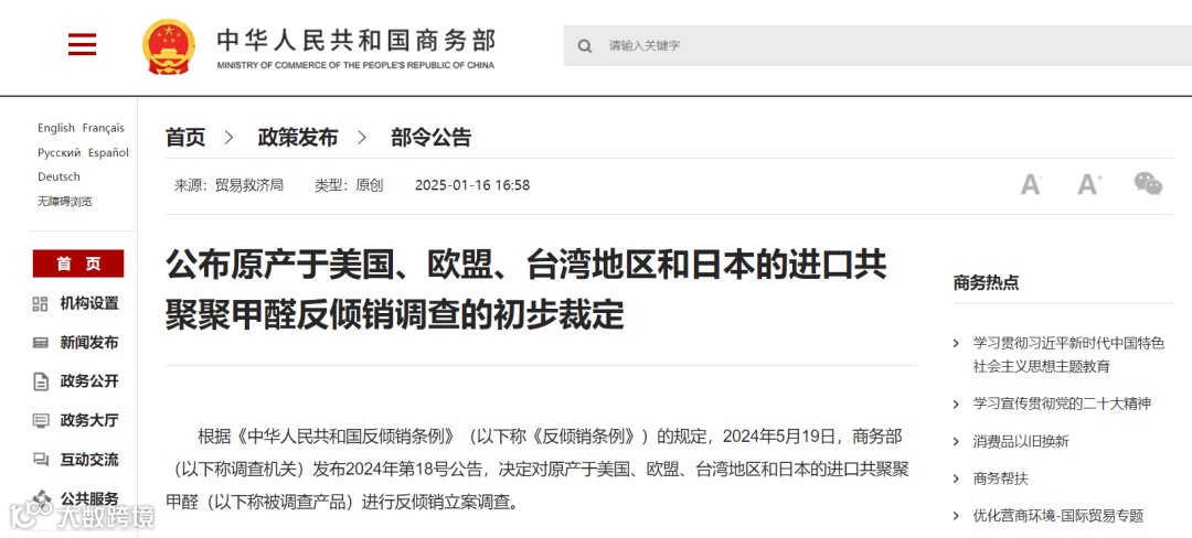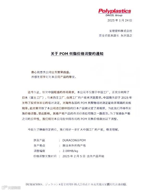 近期,商务部宣布,我国针对来自日本、欧洲、美国的POM发起反倾销终裁,2025年1月24日起执行。对各公司征收的保证金比率如下:美国公司:74.9%,欧盟公司:42%,日本公司:宝理 43.7% 2.旭化成 33.9%,3.其他日本公司 43.7%。台湾宝理塑 3.8%,台塑 4.0%,其他公司32.6%。