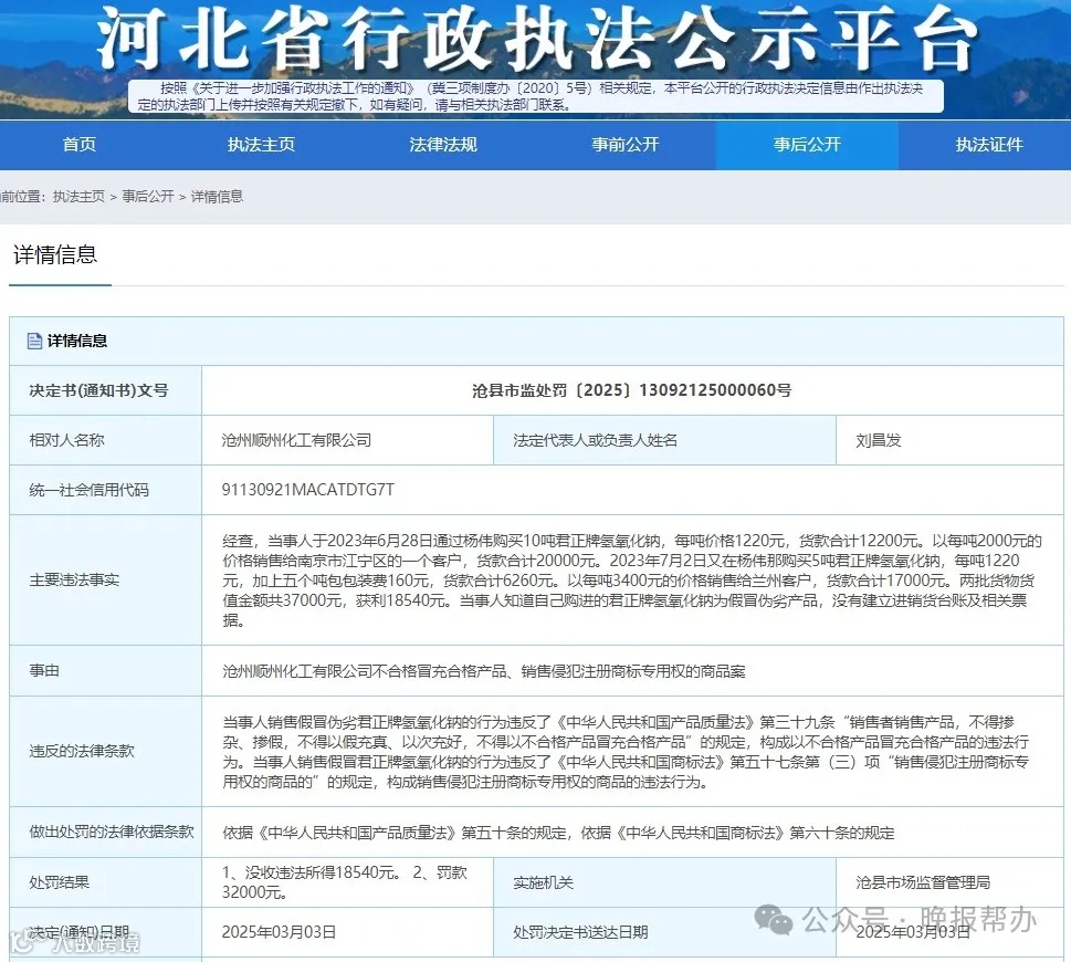 某化工公司卖15吨假片碱被罚款32000元