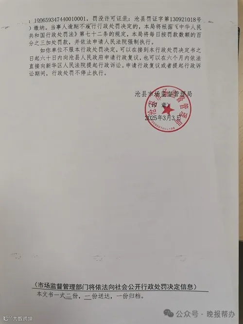 近日,河北省人民政府网站“行政执法公示平台”发布了沧县市场监督管理局于3月3日作出的“沧县市监处罚〔2025〕13092125000060号”行政处罚决定书。