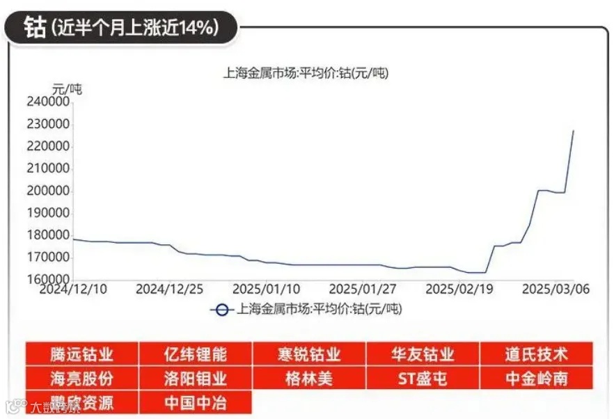 小金属钴国内报价飙升至3.67万元/吨,10日之内上涨超过37%,最高涨幅接近50%。原因是刚果民主共和国(刚果(金))于2月宣布的为期四个月的出口禁令,叠加当地政治动荡的传闻,市场恐慌迅速发酵。出口禁令让市场提前进入“预期定价”模式,从刚果(金)到中国的运输周期长达70至80天,真正的供应缺口可能要到夏季才显现。