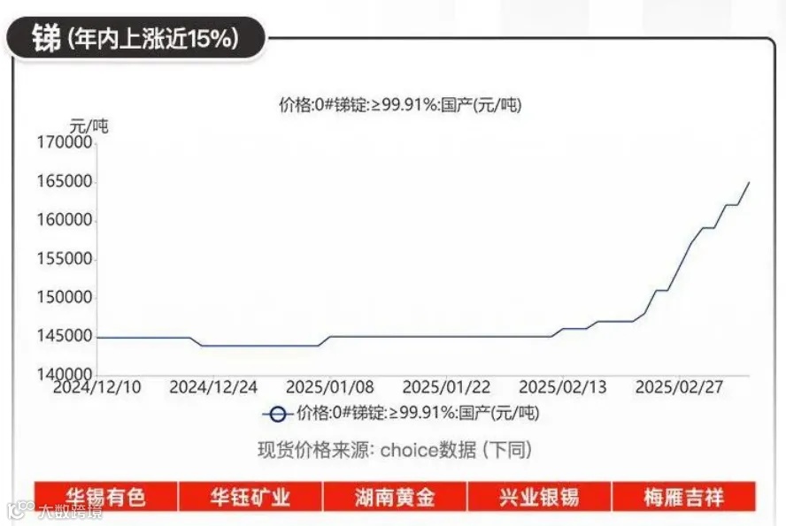 另一种小金属——锑的涨势也十分骇人。99.65%纯度锑锭报价突破17万元/吨,较年初累计上涨近20%。去年上半年,受环保政策影响,国内锑矿主产地湖南等地矿山生产受限,叠加俄罗斯进口锑矿因地缘政治等因素阶段性受阻,供应端收缩明显。