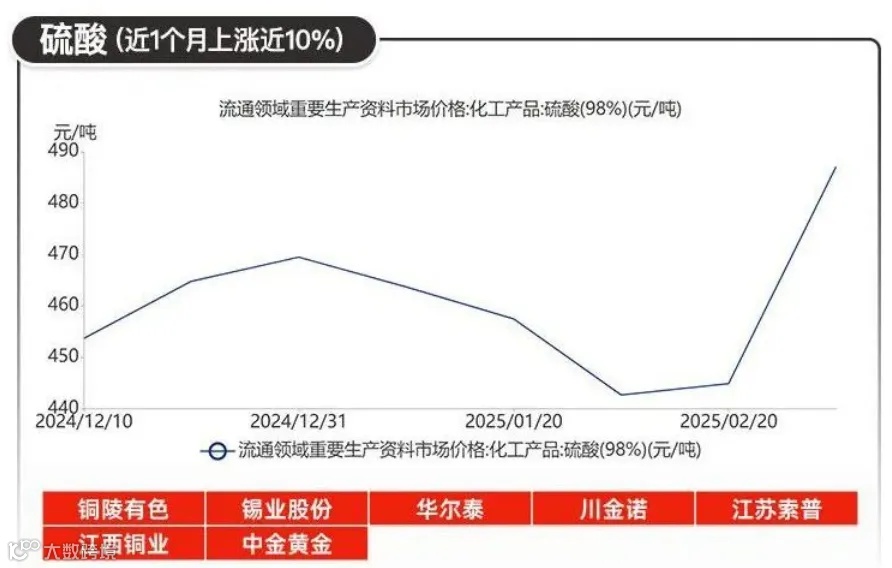 硫磺价格影响了下游硫酸报价,国内98%硫酸市场价557.5元/吨,14个工作日内涨幅达23.97%。酸企受成本及需求支撑,仍存一定推涨意愿。莱芜、招远地区部分装置临时短停,供应减量,东营、西部、莱芜等地区各主力酸厂酸价连续上调。
