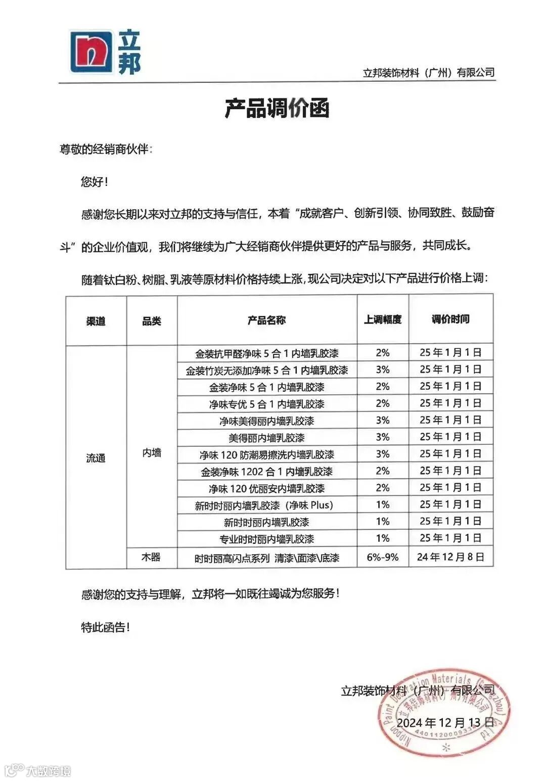 ▶▶涂料巨头立邦装饰材料(广州)有限公司发布产品调价函,决定从2025年1月1日开始对流通渠道的内墙乳胶漆进行价格上调,涨幅1%-3%左右。早在今年12月8日,立邦木器漆时时丽高闪点系列清漆/面漆/底漆已经开始将价格上调了6%-9%。
