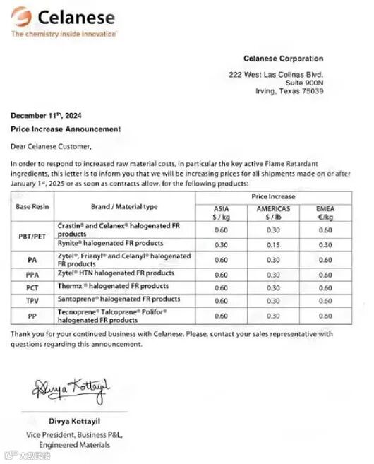 从2025年1月1日起,PA、PP价格上调4379元/吨!其中PBT/PET产品,亚洲区域每公斤上调0.3-0.6美元(约等于2190-4379元/吨)。