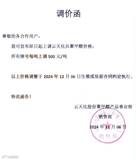 ▶▶近日,大型国有控股上市公司云南云天化股份有限公司发布产品调价函,2024年12月06日云天化股份聚甲醛产品事业部发布调价函,对云天化共聚甲醛所有牌号价格上调500元/吨,并表示价格调整于2024年12月06日生效或依据合同约定执行。