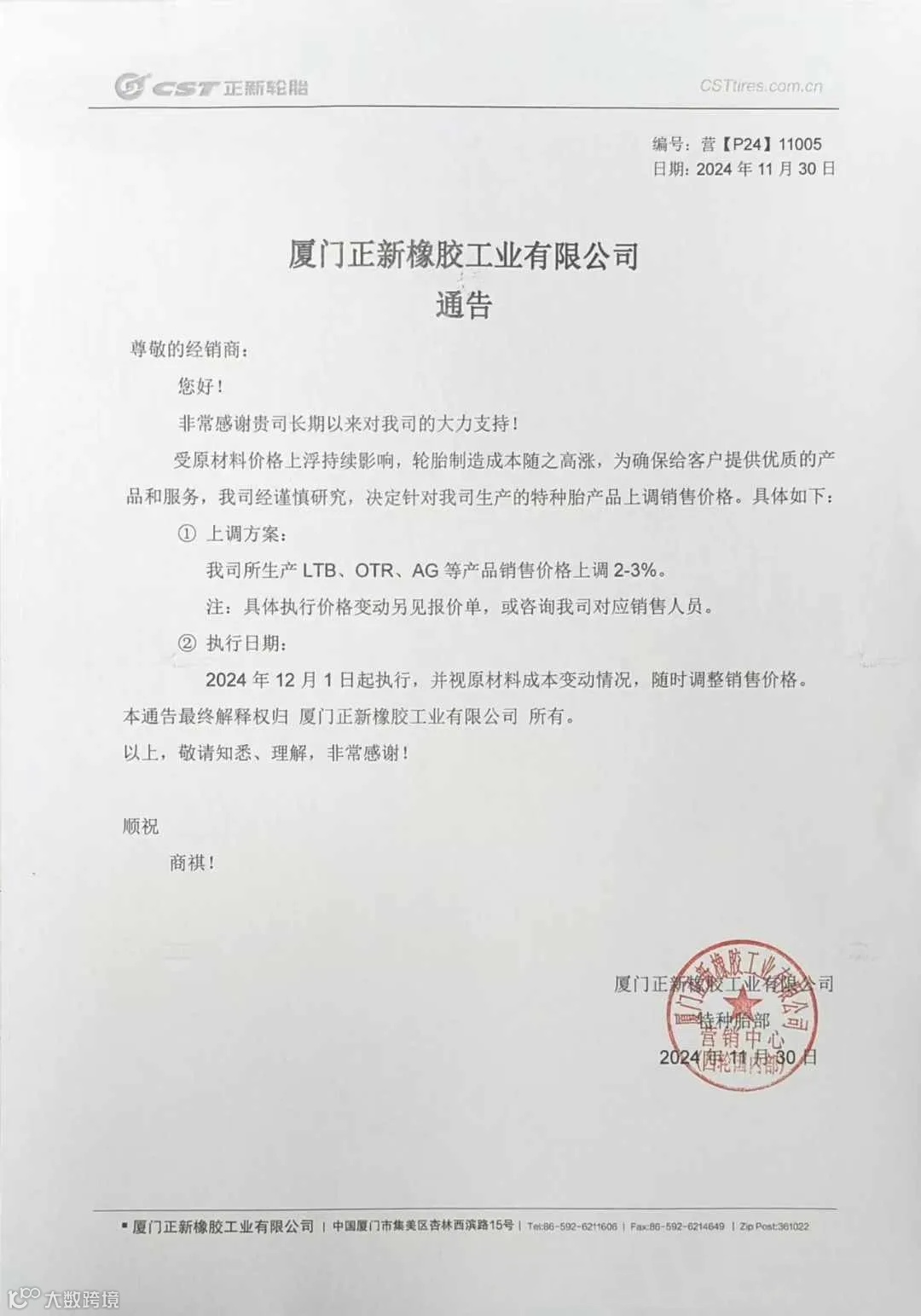 ② 执行日期:2024年12月1日起执行,并视原材料成本变动情况,随时调整销售价格。本通告最终解释权归厦门正新橡胶工业有限公司所有。