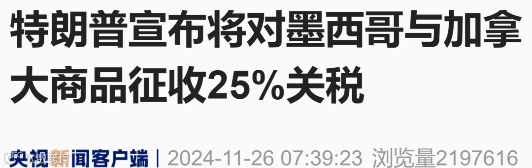当地时间25日,美国当选总统特朗普表示,将对墨西哥和加拿大进入美国的所有产品征收25%关税。此外,特朗普还宣布将对中国商品额外征收10%的关税。