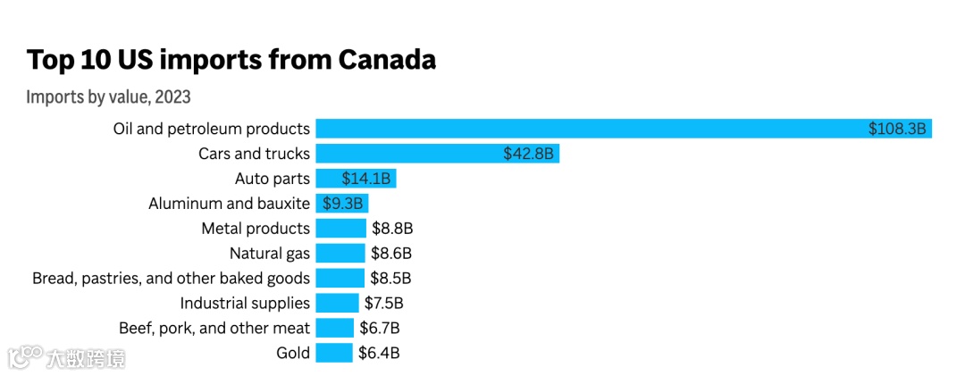 如下图为2023年,美国从加拿大进口商品价值的前10名。其中,原油的进口额为1080亿美元,远超其他商品的进口额。