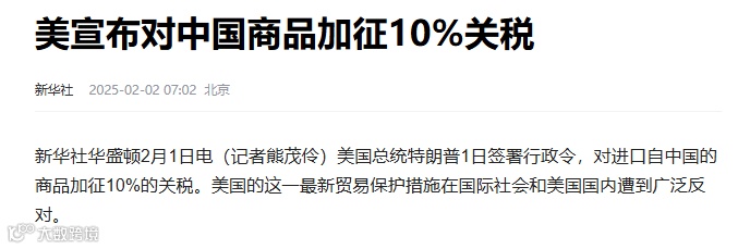 1月31日,川普总统宣布,将从2月1日起对从中国进口的商品全面加征10%关税。此前,10%关税将是在已对中国产品征收的进口税之上加征的。美国已经对中国的电动汽车增收100%的关税,太阳能硅片和多晶硅的税率将提高至50%。