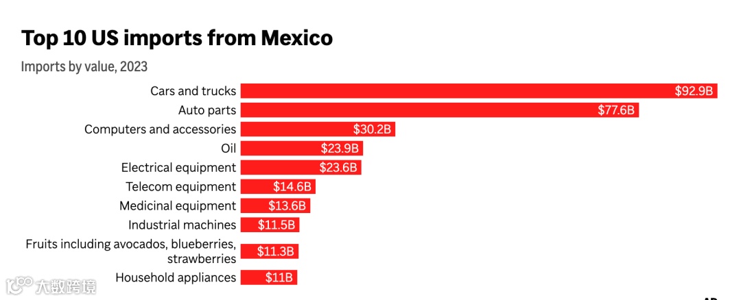 如下图为2023年,美国从墨西哥进口商品价值的前10名。其中,汽车的进口额为929亿美元,汽车配件的进口额为776亿美元,远超其他商品的进口额,约占当年所有此类汽车进口的40%。