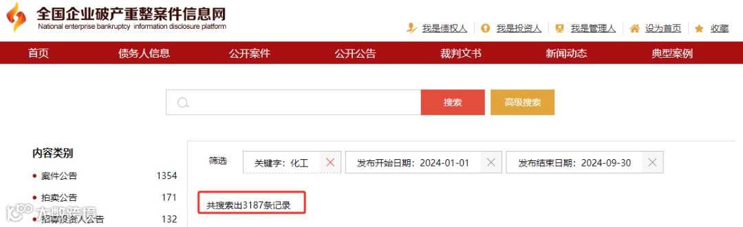 据全国企业破产重整案件信息网数据,今年前三季度,化工行业今年内破产重整的案件共3187条记录。