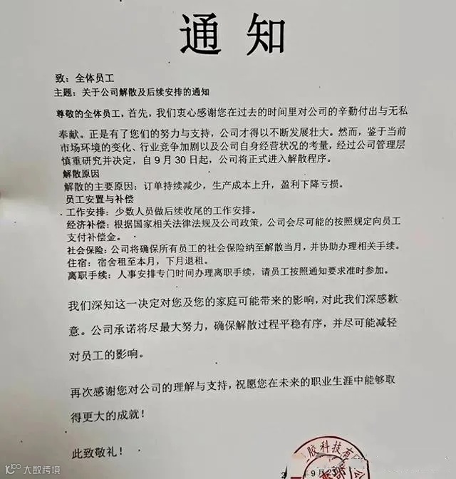 近日,东莞一家经营多年的塑胶制造工厂发布通知,宣布进入解散程序,引起了广泛关注。