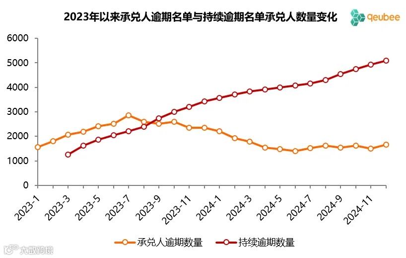 根据上海票交所公布的承兑人逾期名单和持续逾期名单显示,下半年发生3次以上票据逾期,且月末有逾期余额或当月有票据逾期行为发生的承兑人数量为1651家;截至2024年12月31日,6个月内发生3次以上承兑人逾期的承兑人数量为5084家,2023年以来,这个数据持续增大。