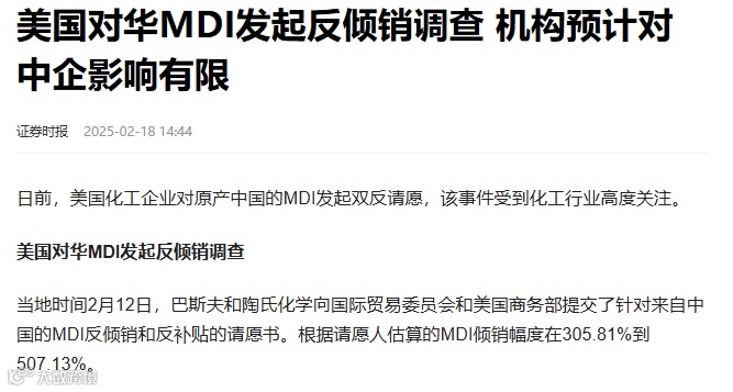 事实上,中国出口至美国的MDI目前已面临41.5%的高额关税。在特朗普的首个总统任期内,在原有6.5%的普通关税基础上,中国出口至美国的MDI产品自2019年起被加征25%的关税。在特朗普二度当选美国总统后,与其他中国出口美国产品一样,MDI产品自今年2月起又被额外加征了10%的关税。