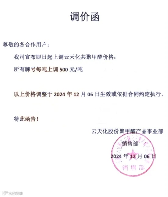 2024年12月06日云天化股份聚甲醛产品事业部发布调价函,对云天化共聚甲醛所有牌号价格上调500元/吨,并表示价格调整于2024年12月06日生效或依据合同约定执行。