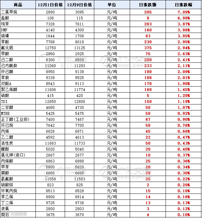 据广化君监测数据统计,12月至今,已有37种原料价格出现上涨: