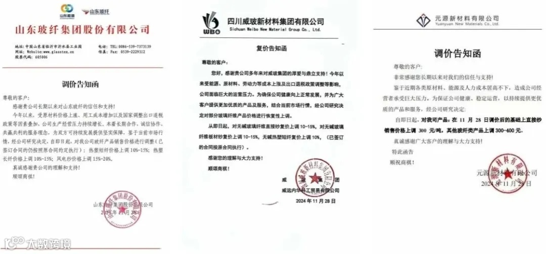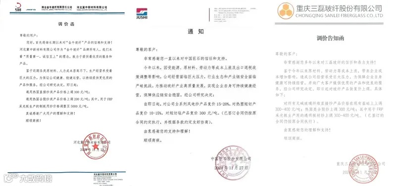 11月28日,泰山玻纤、重庆国际复材、山东玻纤、四川威玻、长海股份、元源新材等玻璃纤维厂家陆续发布调价函,调价幅度为10%-20%,涉及的产品种类有:风电纱、热塑短切产品、直接纱、合股纱、短切毡等。