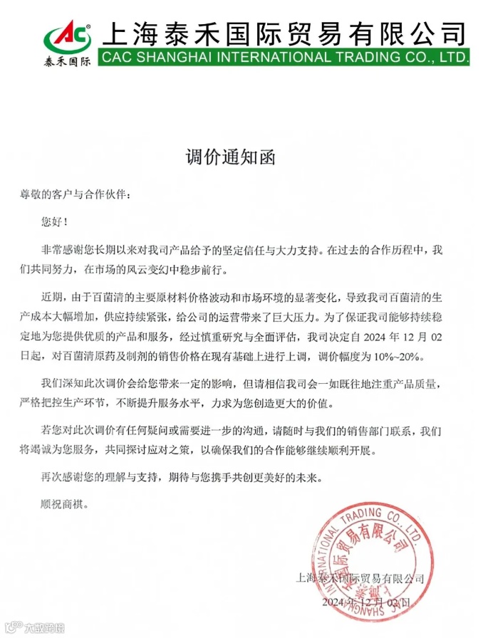 12月5日,上海泰禾国际贸易有限公司(简称″泰禾国际″)通过母公司南通泰禾旗下公众平台—泰禾国际发布了百菌清产品调价通知。决定自2024年12月2日起,对百菌清原药及制剂的销售价格在现有基础上进行上调,调价幅度为10%~20%。