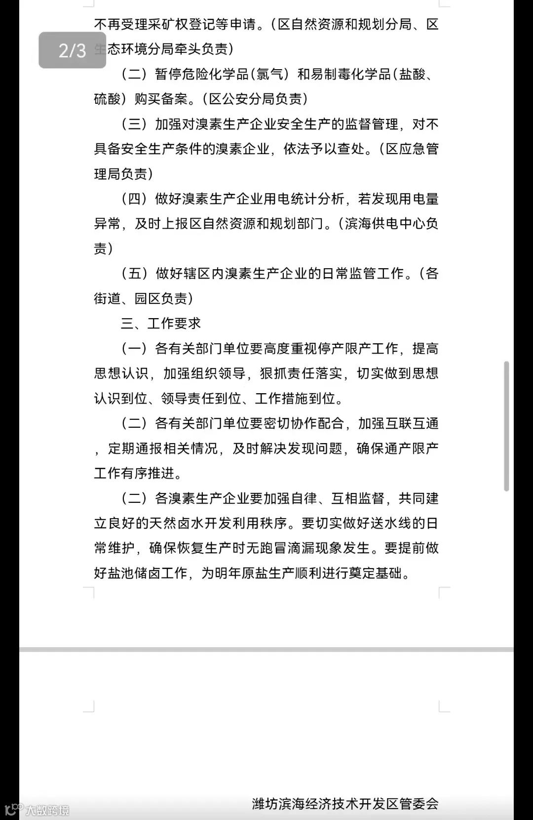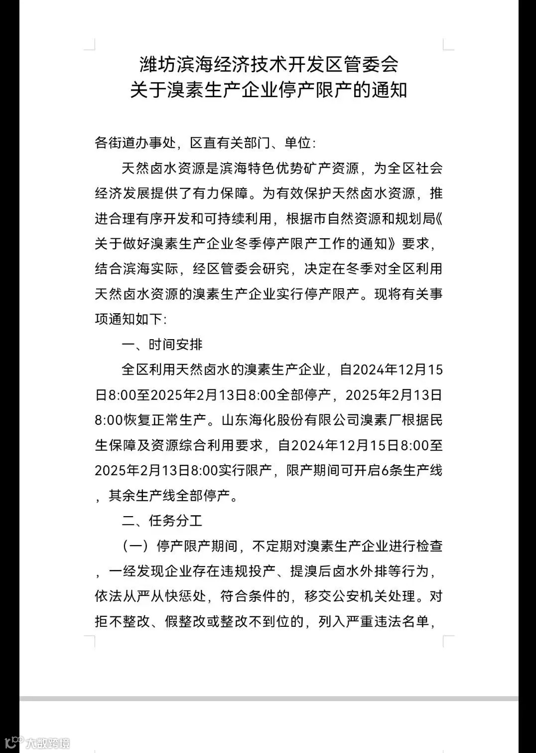 近日,潍坊滨海经济技术开发区管委会发布关于溴素生产企业冬季停产限产的通知: