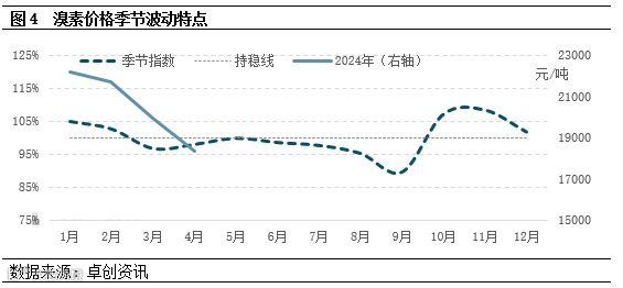溴素的供应受到自然条件温度的影响相对较大,季节波动特点明显。从历史5年的季节性波动特点来看,1月、2月、10月、11月及12月的价格处于年均水平的相对高位,3-9月份处于年均水平的相对低位。