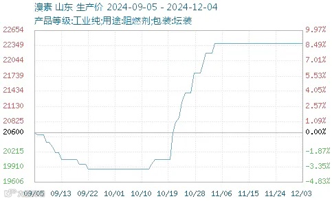 如今正值12月,随着温度的下降原料供应减少,正是溴素价格攀升的阶段,数据显示,10月份至今,溴素市场价已经从19900元/吨涨至22350元/吨,涨额达2450元/吨。