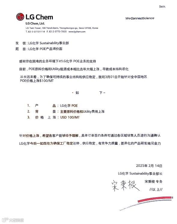在化工行业的风云变幻中,近期LG化学发布涨价函,宣布由于POE原料价格和Utility能源成本相比去年大幅上涨,导致成本结构恶化,从长远来看,为了确保可持续的事业结构和供应稳定,我司3月01日开始针对全中国地区 POE价格上涨$100/MT(约等于人民币725元/吨)。