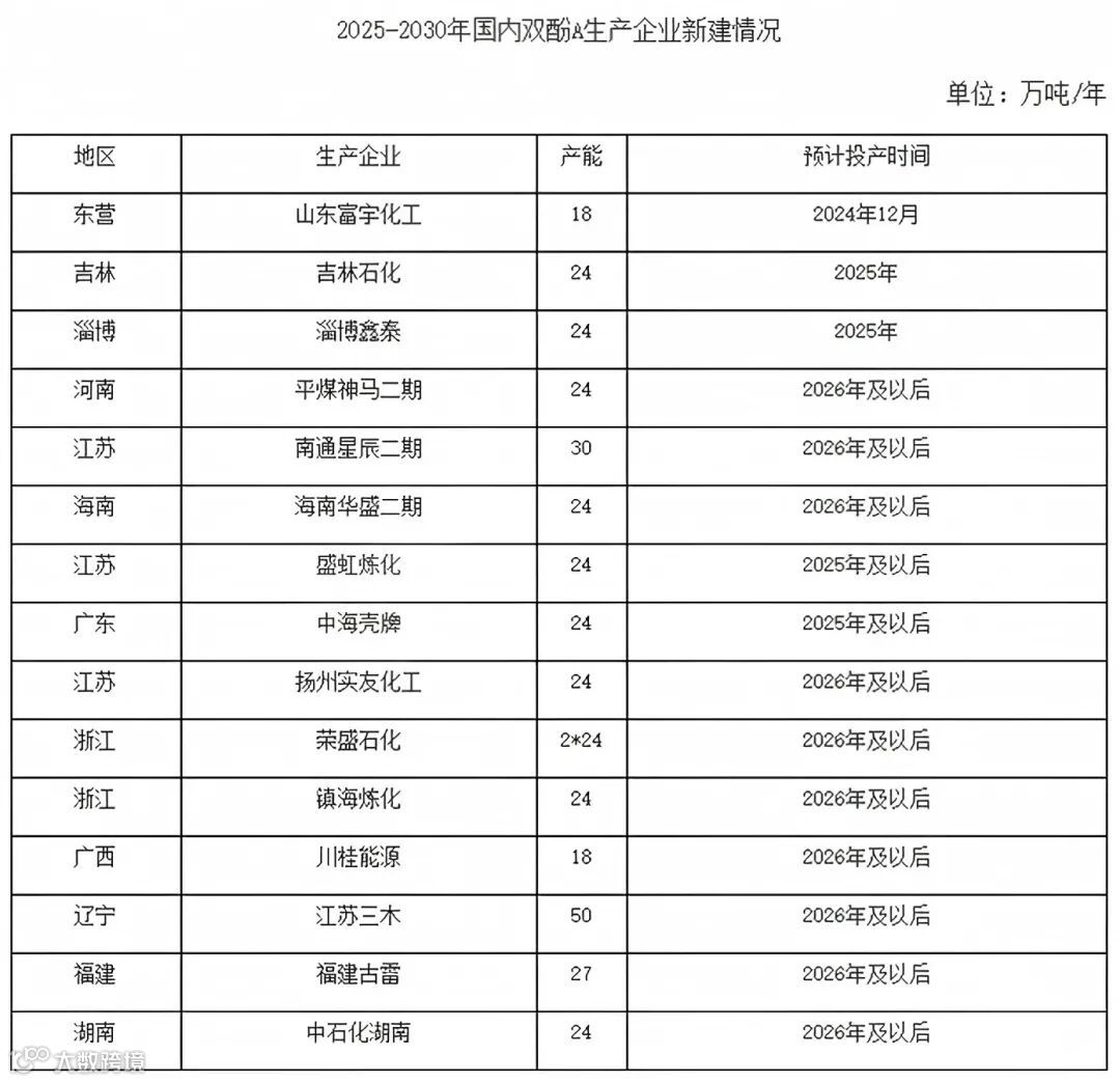 据不完全数据统计,预计2025-2030年,我国双酚A新增产能大约在407万吨,届时我国双酚A总产能将达到998.1万吨。未来国内双酚A扩能步伐不减,尽管大批新项目的投建,多为产业链一体化形式出现,但双酚A下游需求增长难匹配,供需矛盾愈发明显。