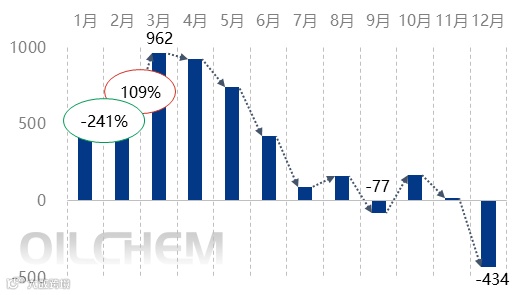 下半年来看,国内PC新老装置开工十分稳定,行业产量及产能利用率均迭创新高,而下游需求表现低迷,供需矛盾持续激化,PC价格也不断弱势下探,而双酚A受产业链成本支撑,价格波动幅度相对有限,上下游价差收窄,PC行业盈利水平也不断下降,7-12月平均毛利仅为-16元/吨,较上半年减少102.30%,其中,9、12月均毛利两度出现负值。