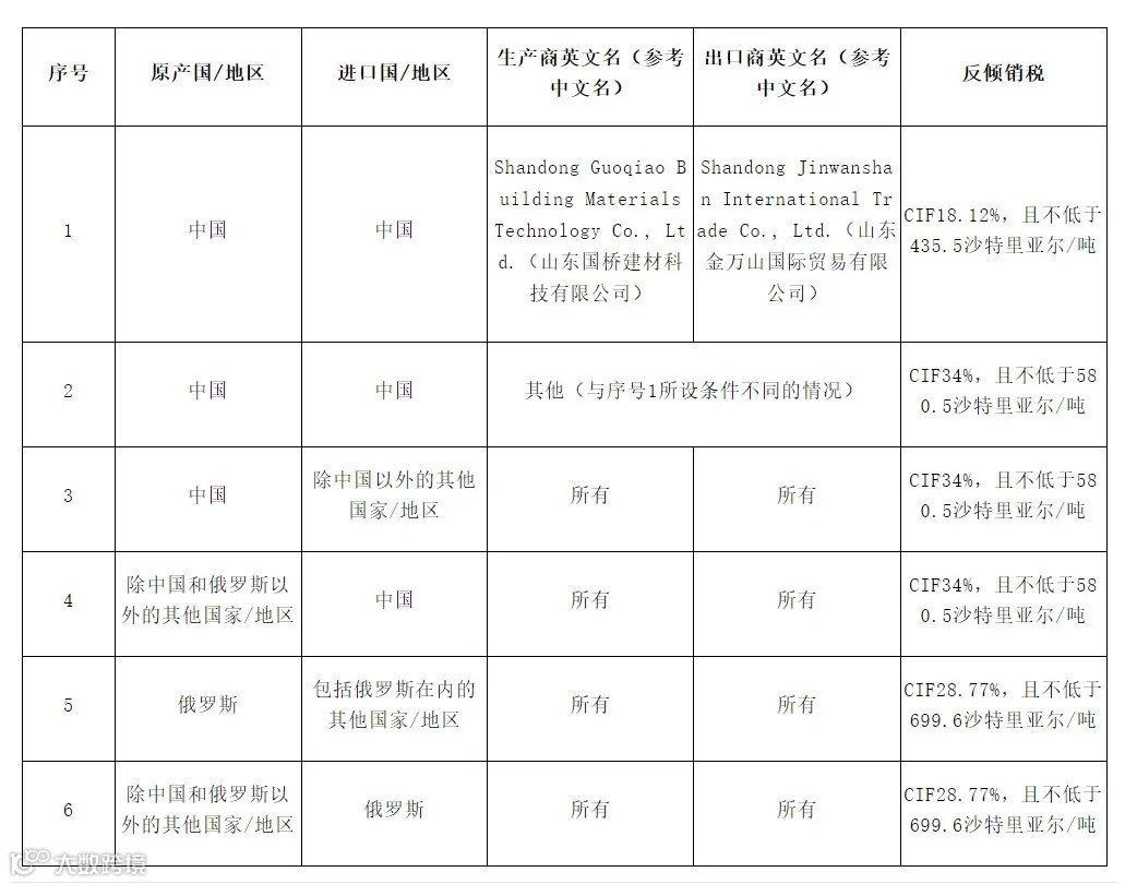 沙特表示,该决定是根据《国际贸易救济法》发布,旨在保护国内产业免受不公平贸易行为的破坏。