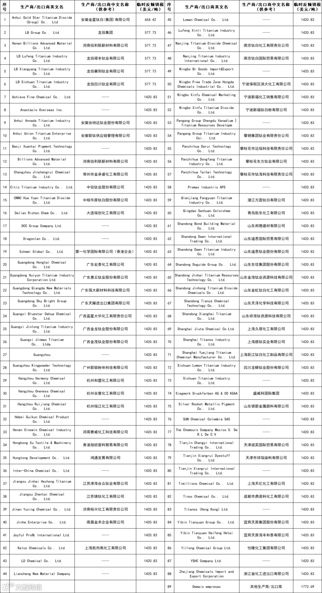 欧亚经济联盟对原产于中国二氧化钛反倾销终裁披露,裁定涉案产品存在倾销,建议对中国生产商/出口商征收为期五年的反倾销税,其中,龙佰集团、河南佰利联新材料、龙佰禄丰钛业、龙佰四川钛业及龙佰襄阳钛业税率均为14.27%,山东道恩钛业及中国其他生产商/出口商税率均为16.25%。