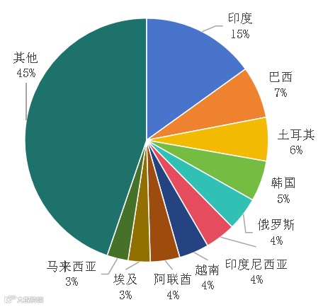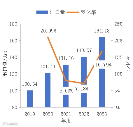 2023年我国钛白粉出口量从2019年的100.35万吨增长至164.16万吨,增幅超63%,约占中国当年产能的40%。这些钛白粉出口至154个国家和地区,其中印度(15%)、巴西(7%)、土耳其(6%)、韩国(5%)、俄罗斯(4%)排行前五。从出口金额分析,2023年中国钛白粉出口月均价2192.54美元/吨,同比下降18.97%。这也就解释了,为何众多国家认为中国低价倾销伤害了本土经济和生产商。