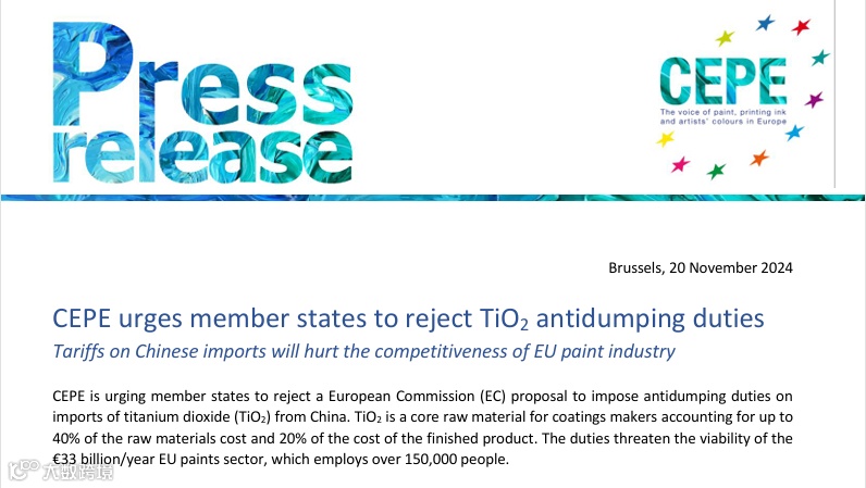 欧洲涂料、油墨委员会(CEPE)敦促成员国拒绝对中国钛白粉征收反倾销税。TiO2是涂料制造商的核心原材料,占原材料成本的40%和成品成本的20%。征收反倾销税将严重影响当地涂料行业,尤其是小公司和建筑业,这些关税威胁到每年330亿欧元的欧盟涂料行业的生存。使欧盟公司的竞争力下降,从而减少出口并威胁欧洲制造商的市场地位。