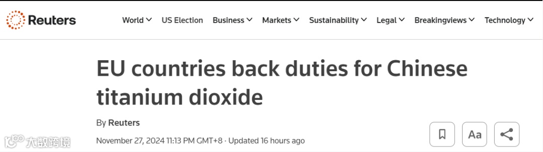近日,欧盟成员国批准了对从中国进口的二氧化钛(TiO2)征收最终反倾销税的决定。欧盟委员会提议对安徽金星集团每公斤征收0.25欧元的关税,龙佰集团为0.74欧元,其中,对于被视为配合调查的公司,税率为0.64欧元,对于其他所有公司,税率为0.74欧元。