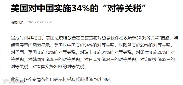 值得注意的是,此前美国已对中国商品加征了20%的关税,而此次又加征了34%的关税。美国财政部长斯科特·贝森特确认,这将使得美国对中国商品加征的关税税率总计高达54%。