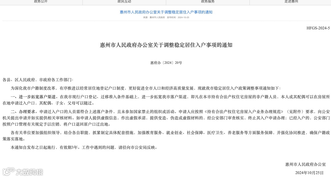 10月25日,惠州市人民政府在官网发布《惠州市人民政府办公室关于调整稳定居住入户事项的通知》(下称通知)。通知称,凡在惠州持有合法产权住宅房屋的非户籍人员,本人或其配偶可以在房屋所在地申请迁入户口,其配偶、子女、父母可以随迁。