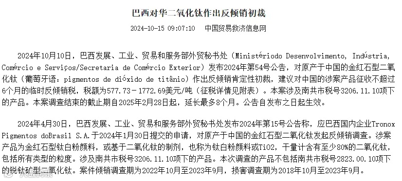 近日,巴西公布了对中国钛白粉的反倾销初裁结果,税额从578美元/吨至1772.69美元/吨不等。初步暂时的加征反倾销税税额为龙佰集团578美元/吨(约25%),安徽金星654美元/吨(中核钛白旗下,约29%),其他列示企业(包括中信钛业、惠云钛业、攀钢钒钛等)为1420.83美元/吨,其他未列示企业为1772.69美元/吨。