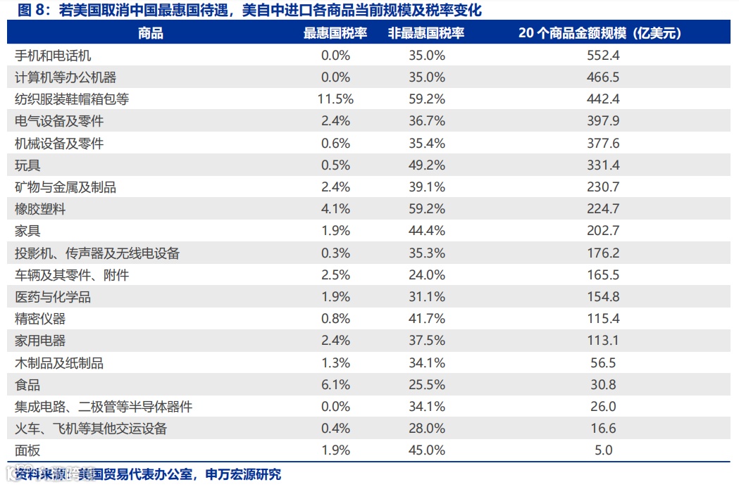 除了加征关税以外,近年来美国连续抛出提案要求取消中国最惠国待遇(MFN),今年呼声再次加强。相比于一般关税措施,最惠国待遇涉及面更广。首轮摩擦后,约48%中国出口商品已不享MFN优惠,2023年上半年,美国对华平均关税飙升至19.3%,较2018年初的2.3%显著提高。取消MFN恐使非最惠国平均关税达42%,叠加额外关税,对华关税或破60%,机电设备、车辆零附件、半导体及矿产制品首受冲击。