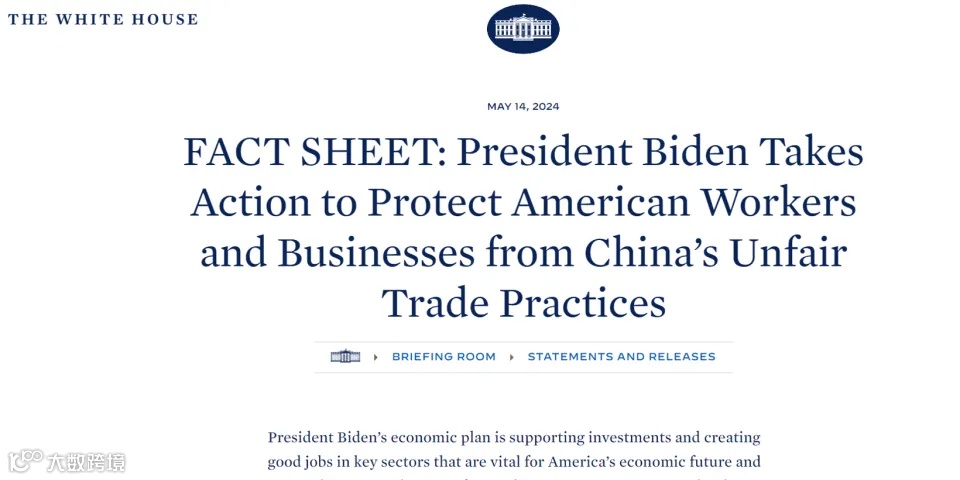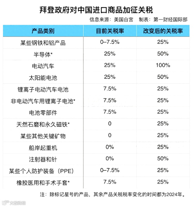 5月16日,美国宣布对华加征301关税四年期复审结果,在原有对华301关税基础上,进一步提高对自华进口的电动汽车、锂电池、光伏电池、关键矿产、半导体以及钢铝、港口起重机、个人防护装备等产品的加征关税。其中,对进口的中国电动汽车征收4倍关税,从25%提高到100%,中国太阳能电池的进口税也将翻一番,从25%提高到50%。从2025年开始,美国进口中国半导体的关税将从25%跃升至50%。