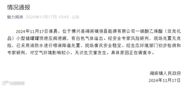 ,11月17日,一能源公司发生气体泄漏,当地应急管理局通报称是碳酸乙烯酯(非危化品)小型储罐罐顶泄压阀泄漏,对空气环境影响小,针对二次泄漏的事情,当地应急局回应称,目前还在核查中。