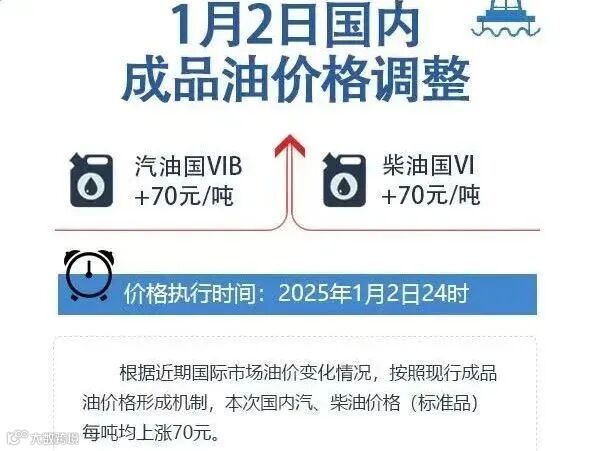 近日,国家发改委发布消息,自2025年1月2日24时起,国内汽、柴油价格每吨均上涨70元。折合成升价,92#汽油每升上调0.05元,95#汽油每升上调0.06元;0#柴油每升上调0.06元。