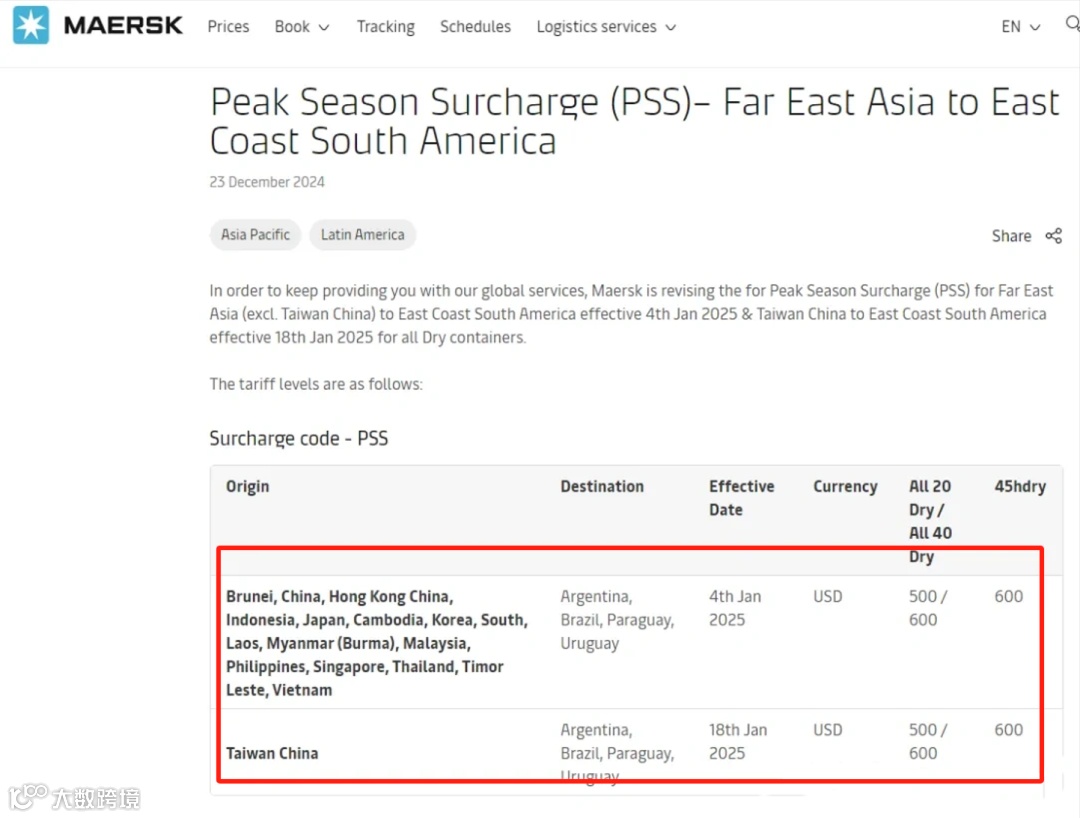 船公司们纷纷发布相关预警、计划征收工作中断附加费、罢工附加费等。马士基宣布,将对所有来自远东至墨西哥、中美洲、南美洲西海岸和加勒比海地区的干集装箱征收旺季附加费(PSS),自2025年1月6日起生效。还征收远东至南美东地区的所有干集装箱旺季附加费PSS。