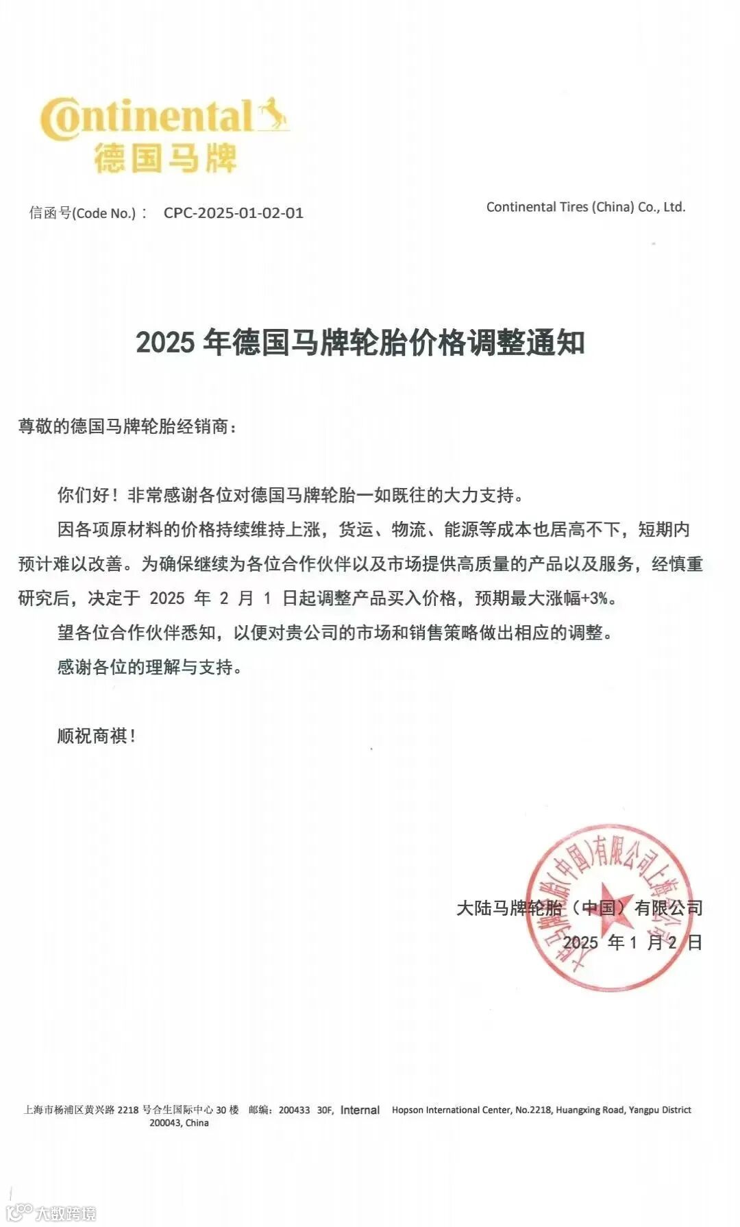 德国马牌发布涨价通知,决定于2025年2月1日起调整产品买入价格,预期最大涨幅3%。