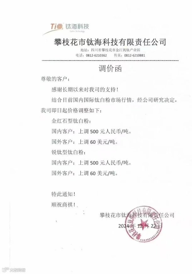 攀枝花市钛海科技有限责任公司发布调价函,国内金红石型及锐钛型钛白粉上调500元/吨,国外客户上调60美元/吨。