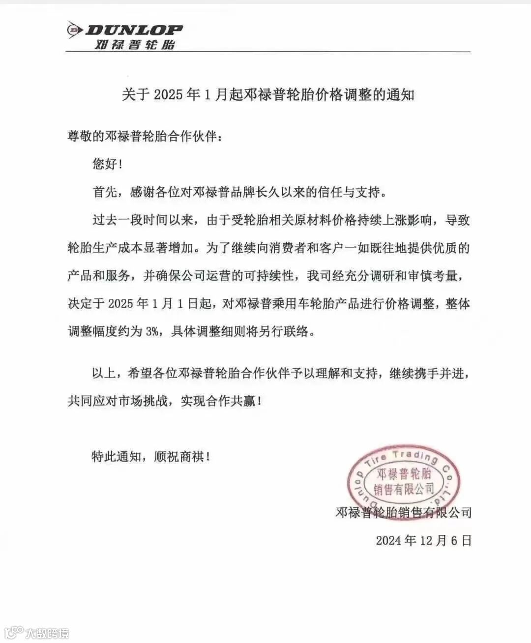 邓禄普轮胎宣布,自2025年1月1日起,其乘用车轮胎产品价格将整体上涨3%。