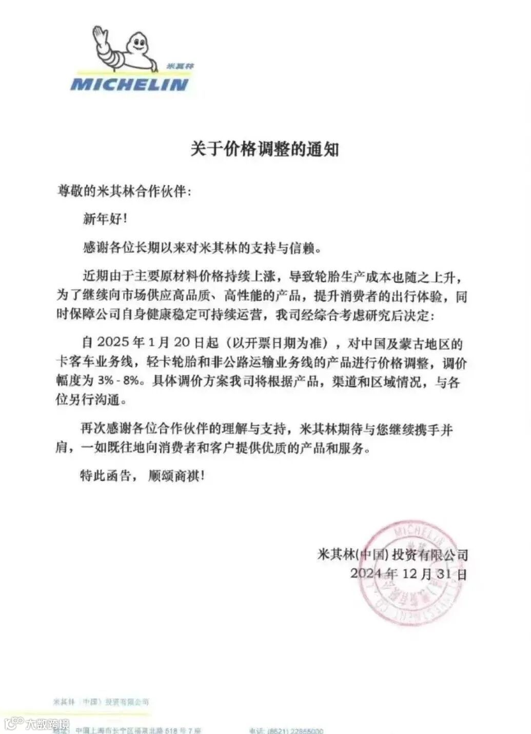米其林决定自2025年1月20日起 (以开票日期为准) ,对中国及蒙古地区的卡客车业务线,轻卡轮胎和非公路运输业务线的产品进行价格调整,调价幅度为3%-8%。