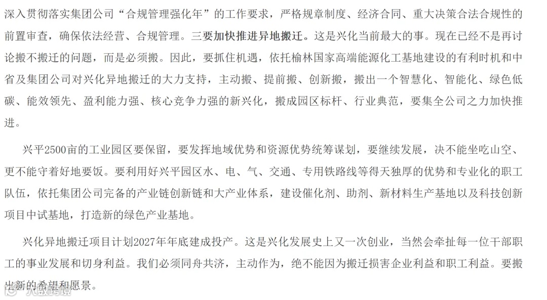 2024年1月12日,陕西省危化办在渭南召开会议:“兴化集团搬迁改造工作方案已上报,计划于2024年底完成就地改造工作任务,于2028年底完成整体搬迁工作任务。”