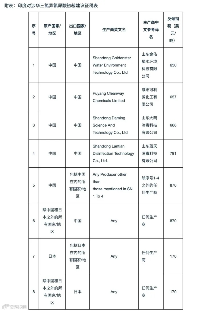 对原产于或进口自中国和日本的三氯异氰尿酸作出反倾销初裁,建议对上述国家的涉案产品征收临时反倾销税,中国为650—870美元/吨。