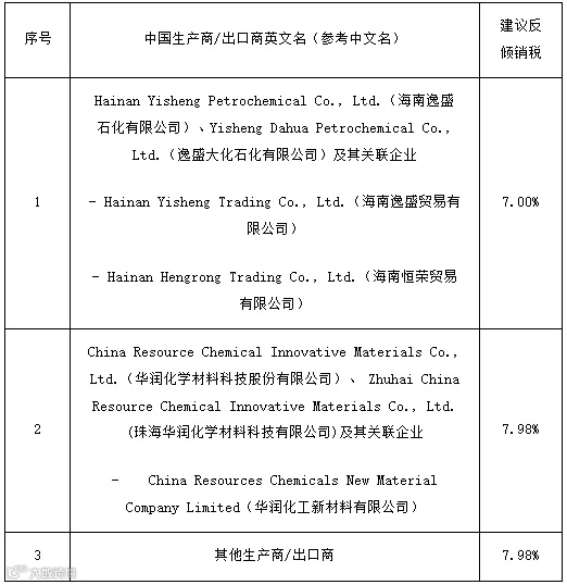 对原产于或进口自中国大陆、韩国、马来西亚、挪威、泰国以及台湾地区的聚氯乙烯糊树脂作出的反倾销初裁建议,对上述国家和地区的涉案产品征收为期6个月的临时反倾销税,中国大陆为115—600美元/吨。