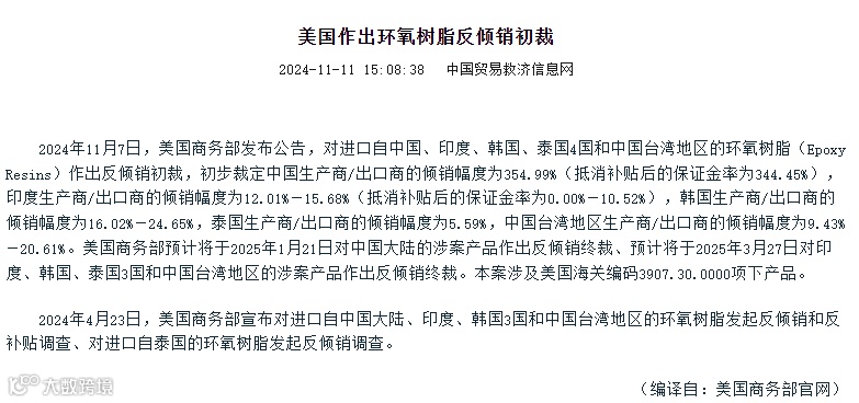 对原产于或进口自中国、韩国和泰国的环氧氯丙烷作出反倾销肯定性终裁,对涉案产品征收为期5年的反倾销税,中国0—216美元/吨。