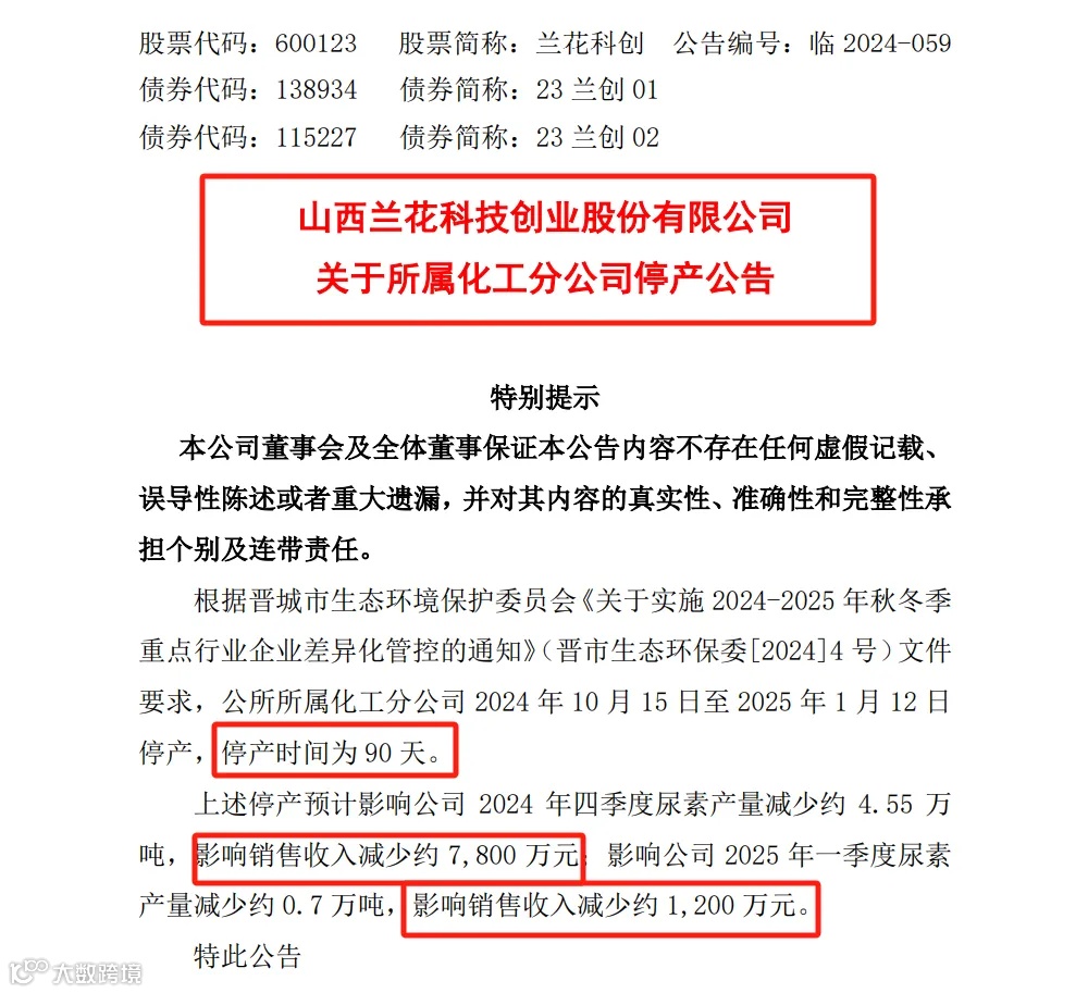 山西兰花科技创业股份有限公司(下称兰花创科)10月14日公告,根据晋城市生态环境保护委员会《关于实施2024-2025年秋冬季重点行业企业差异化管控的通知》(晋市生态环保委[2024]4号)文件要求,所属化工分公司2024年10月15日至2025年1月12日停产,停产时间为90天。